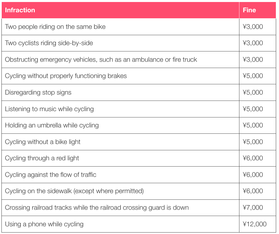 | Cycling on the sidewalk if you're over 70 | ¥5000 |